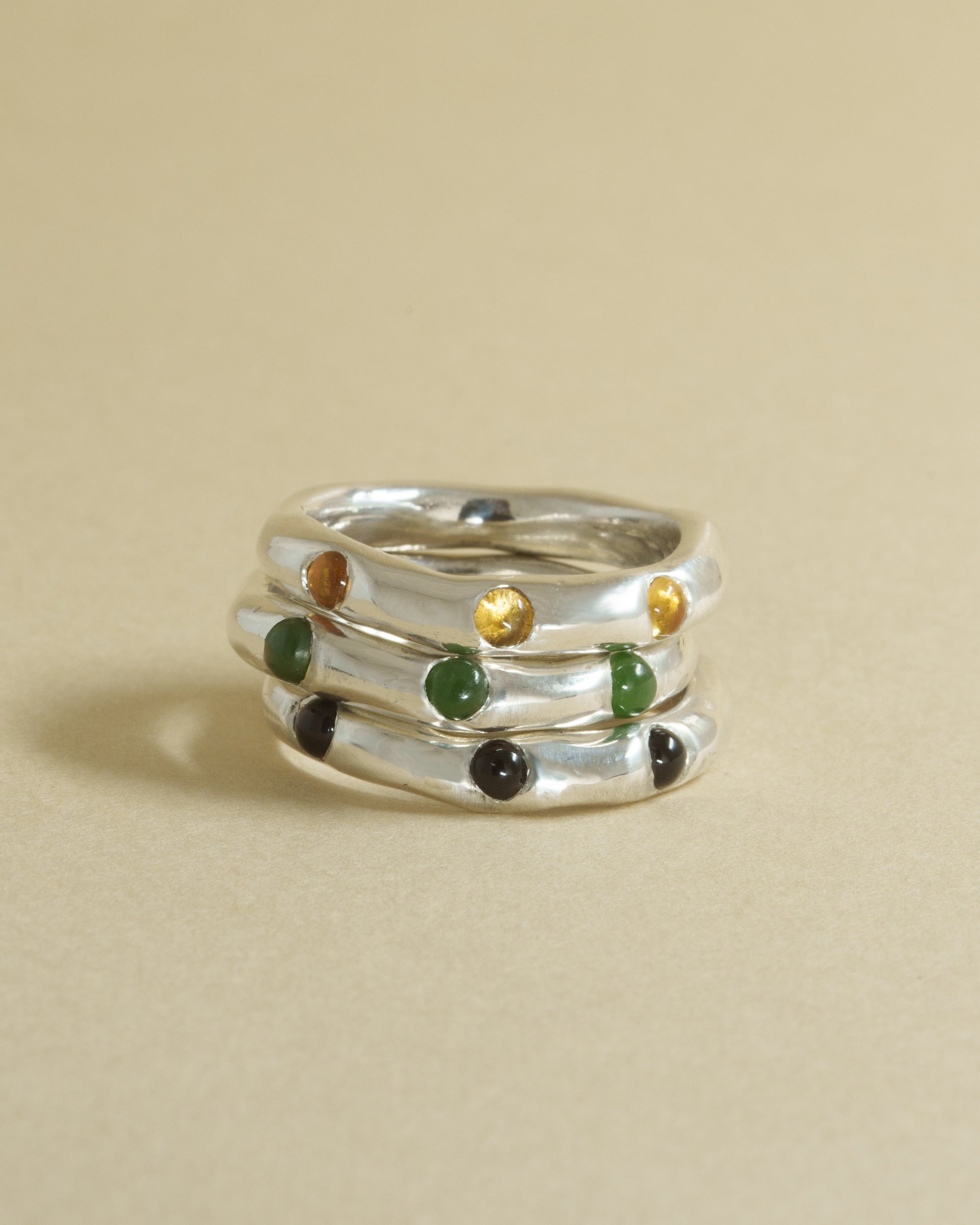 Garúa rings embody the playful essence of a gentle morning rain. Each piece has three flush-set cabochon stones. The Set Garúa III is a suggestion of three Garúa rings. We recommend either a three color mix or one stone selection.